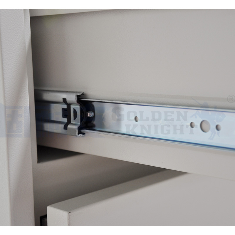 五:抽屜之間配連鎖裝置:用戶如不需要每個抽屜均配置獨立聯鎖,可開啟聯鎖功能,由一把鎖控制全部抽屜。我公司產品出品時已經啟用聯鎖裝置。聯鎖裝置位于每節抽屜圍板右側。